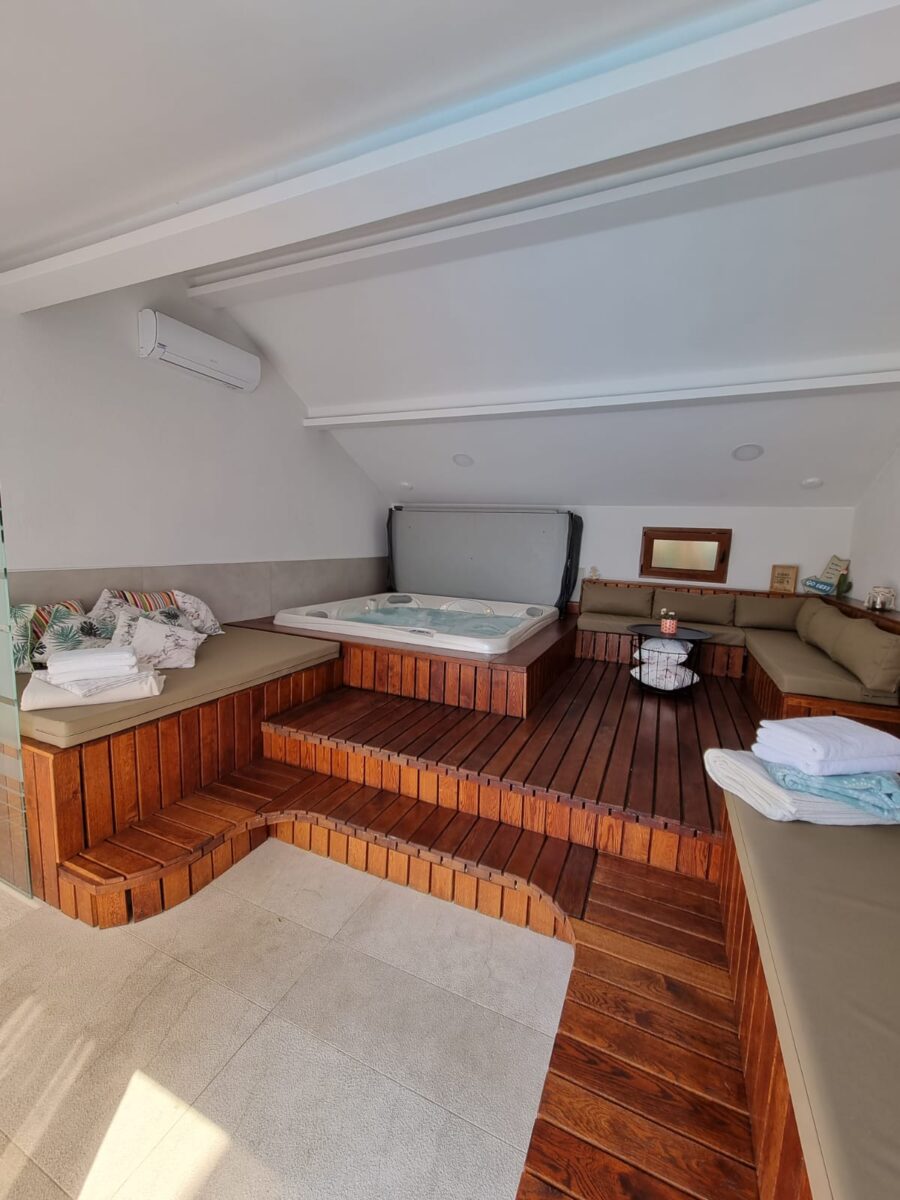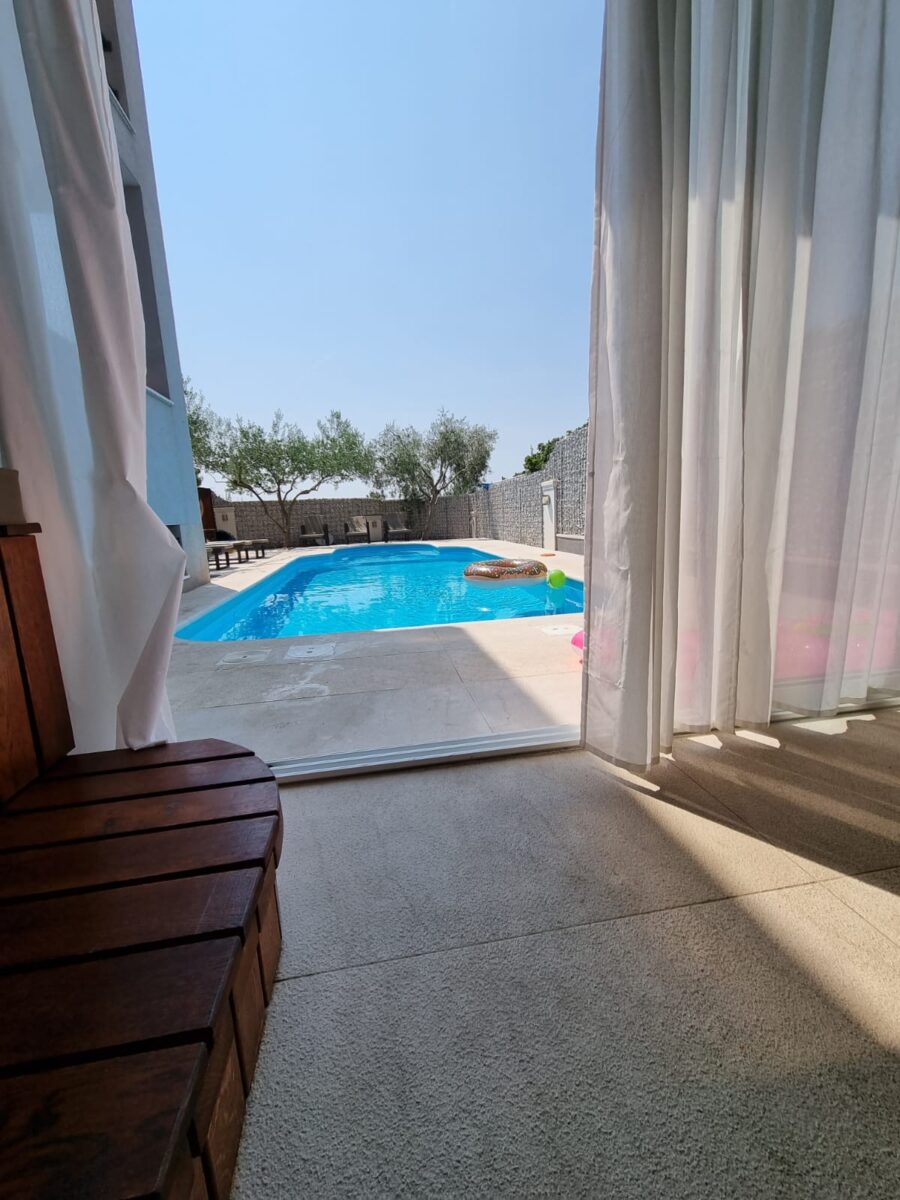 Prizemlje kuće raspolaže s 4 sobe, 3 kupatila, kompletno opremljenom kuhinjom, dnevnim boravkom i velikom terasom. Iz dnevnog boravka u prizemlju ulazi se u zatvoreni jacuzzi odakle se može dalje izići na bazen. Uz bazen se nalazi veliki roštilj na kojem možete uživati u pripremi hrane na otvorenom.