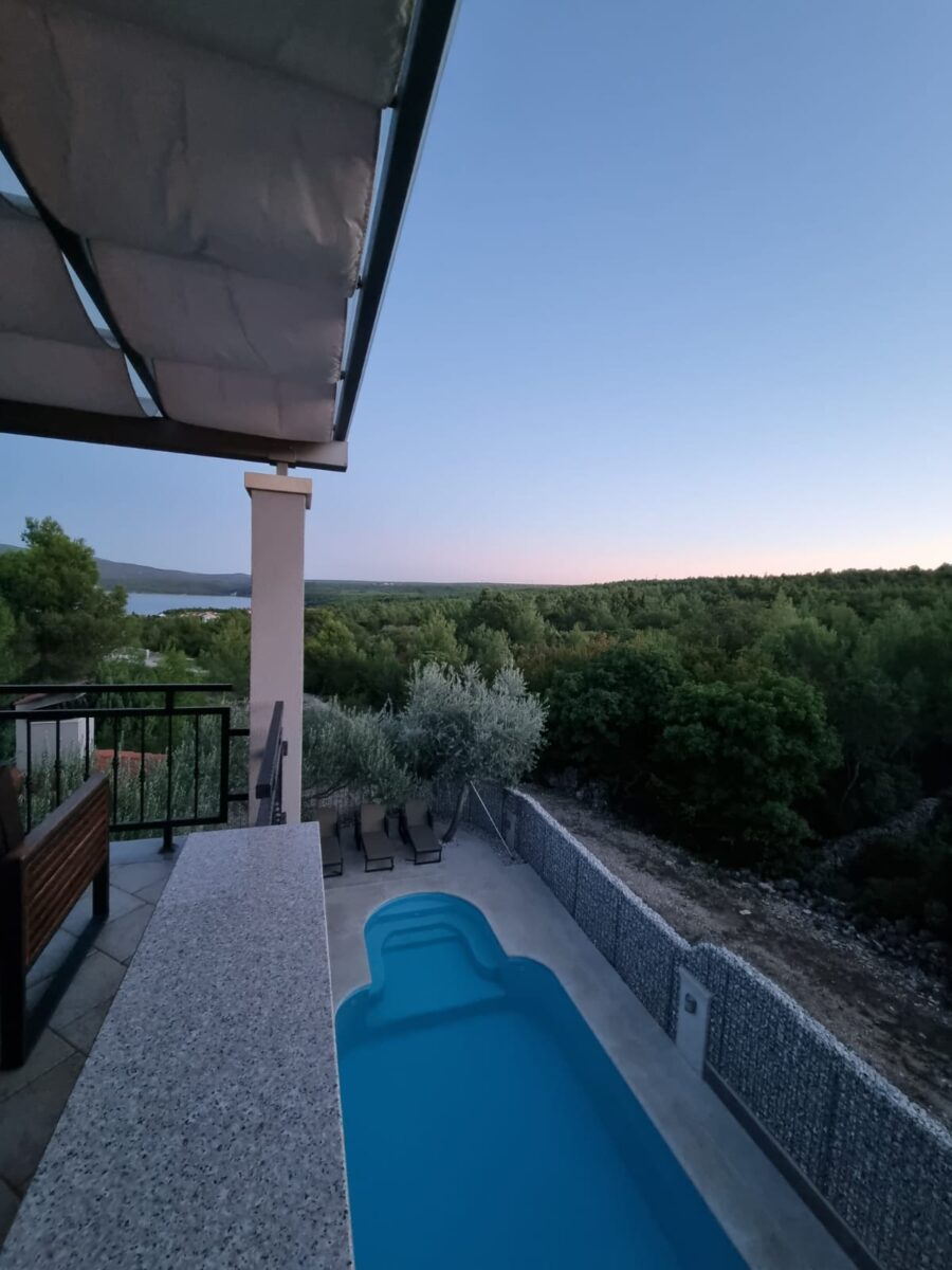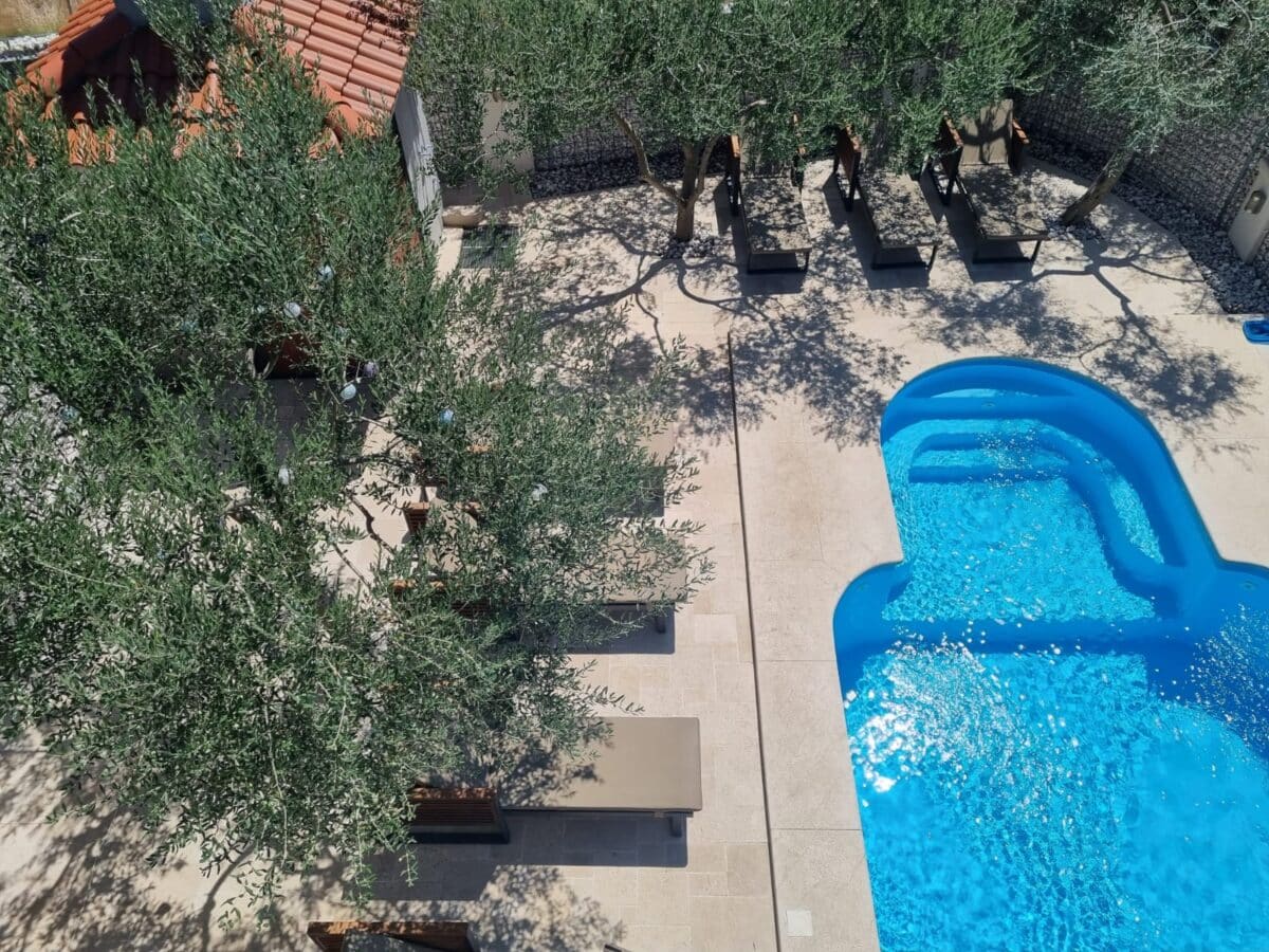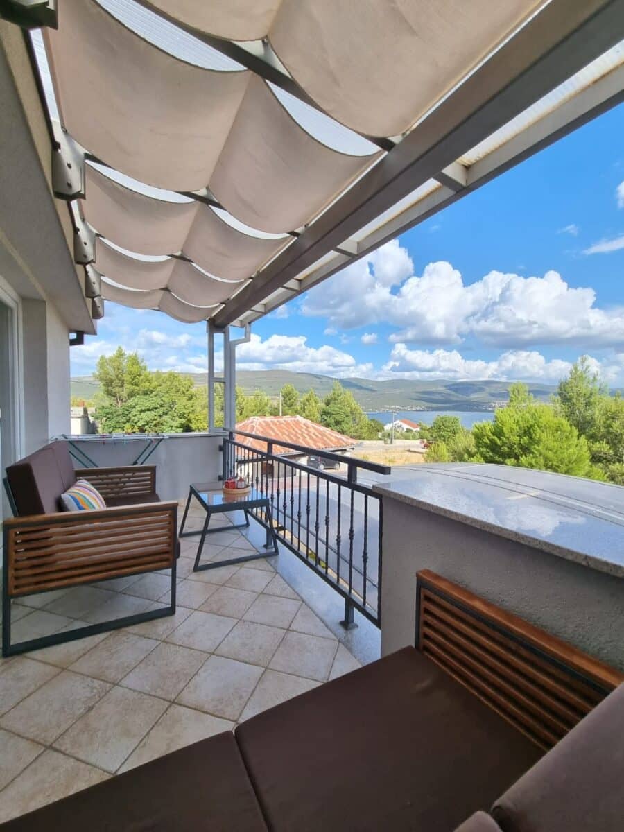 Na katu kuće se nalaze preostala dva apartmana. Svaki od njih raspolaže s 2 sobe, kupatilom, kompletno opremljenom kuhinjom, dnevnim boravkom i terasama s kojih se pruža prekrasan pogled na Karinsko more.